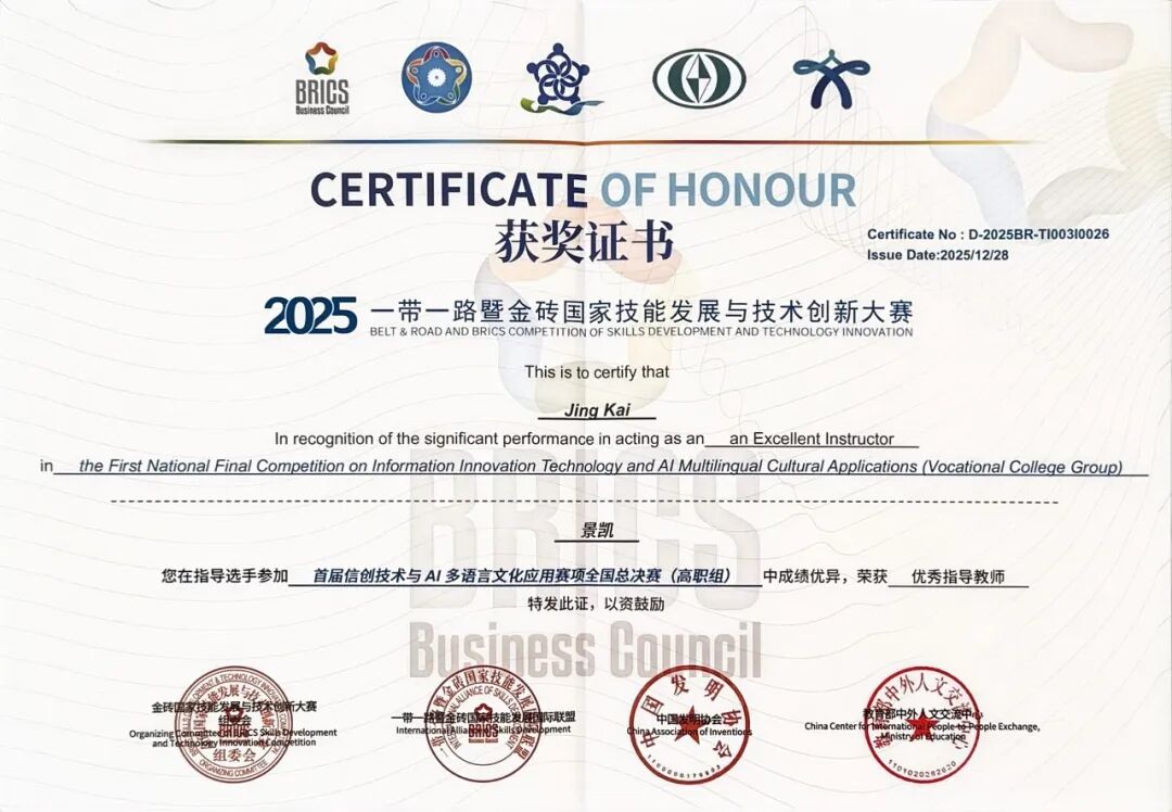 鲁网1月4日讯 近日,2025一带一路暨金砖国家技能发展与技术创新大赛之首届信创技术与AI多语言文化应用赛项全国总决赛落幕。学院信息工程系人工智能技术应用(3+2专本贯通培养)班学生韩佩轩、吴祥鑫组成的参赛队荣获全国总决赛二等奖;指导教师景凯、徐文丽荣获“优秀指导教师”称号;山东服装职业学院荣获“优秀组织奖”。