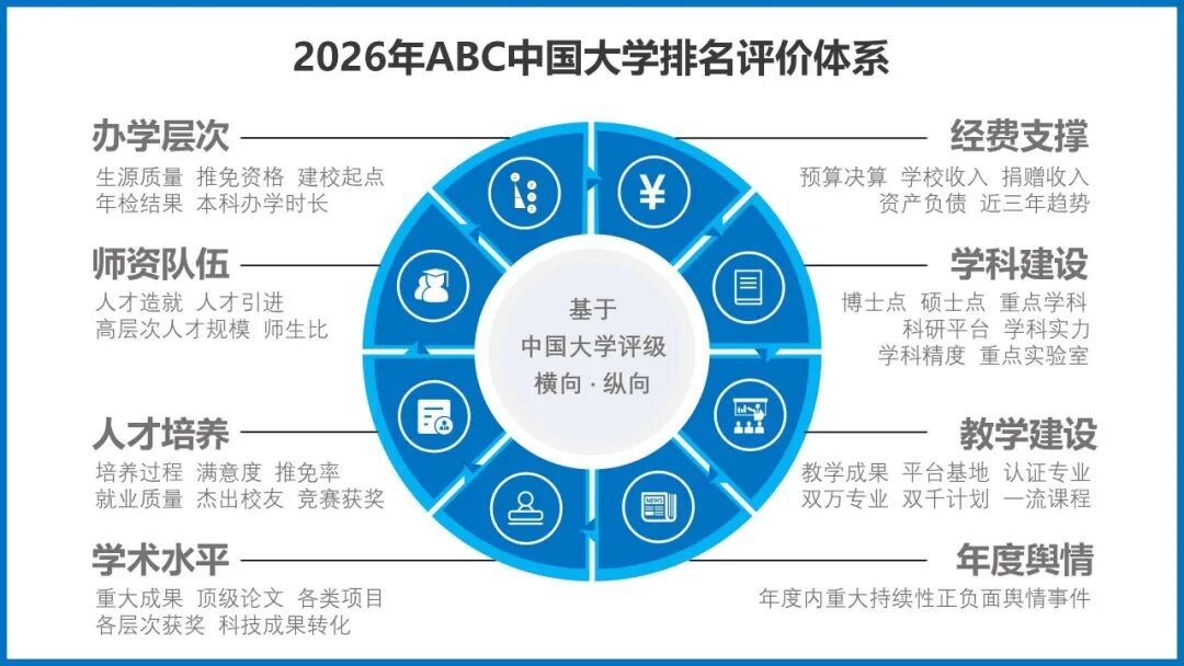 2026年ABC中国大学排名由ABC咨询机构编制,其研究成果通过中国大学排行榜(CNUR)网站发布,该排名涵盖国内1241所本科院校。ABC咨询机构以发现优秀院校为愿景,专注高等教育比较研究,研究成果在教育界和社会各界获得了广泛认可,为考生升学、学校发展提供了重要决策依据;媒体和学术影响力深远,包括人民网、光明网、凤凰网以及各大日报等权威媒体进行了深度报道,实现排名结果全网全覆盖,权威性和影响力在国内处于领先梯队。