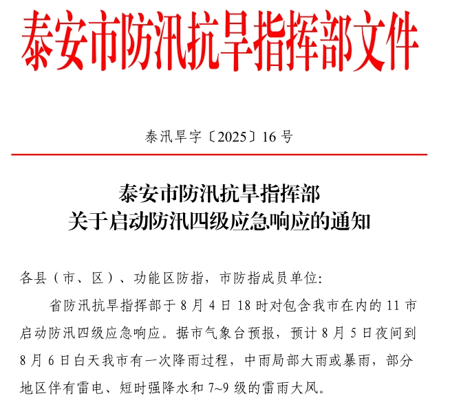 山东省防汛抗旱指挥部于8月4日18时对包含泰安市在内的11市启动防汛四级应急响应。