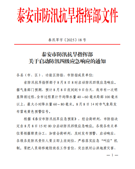 泰安市防汛抗旱指挥部发布关于启动防汛四级应急响应通知