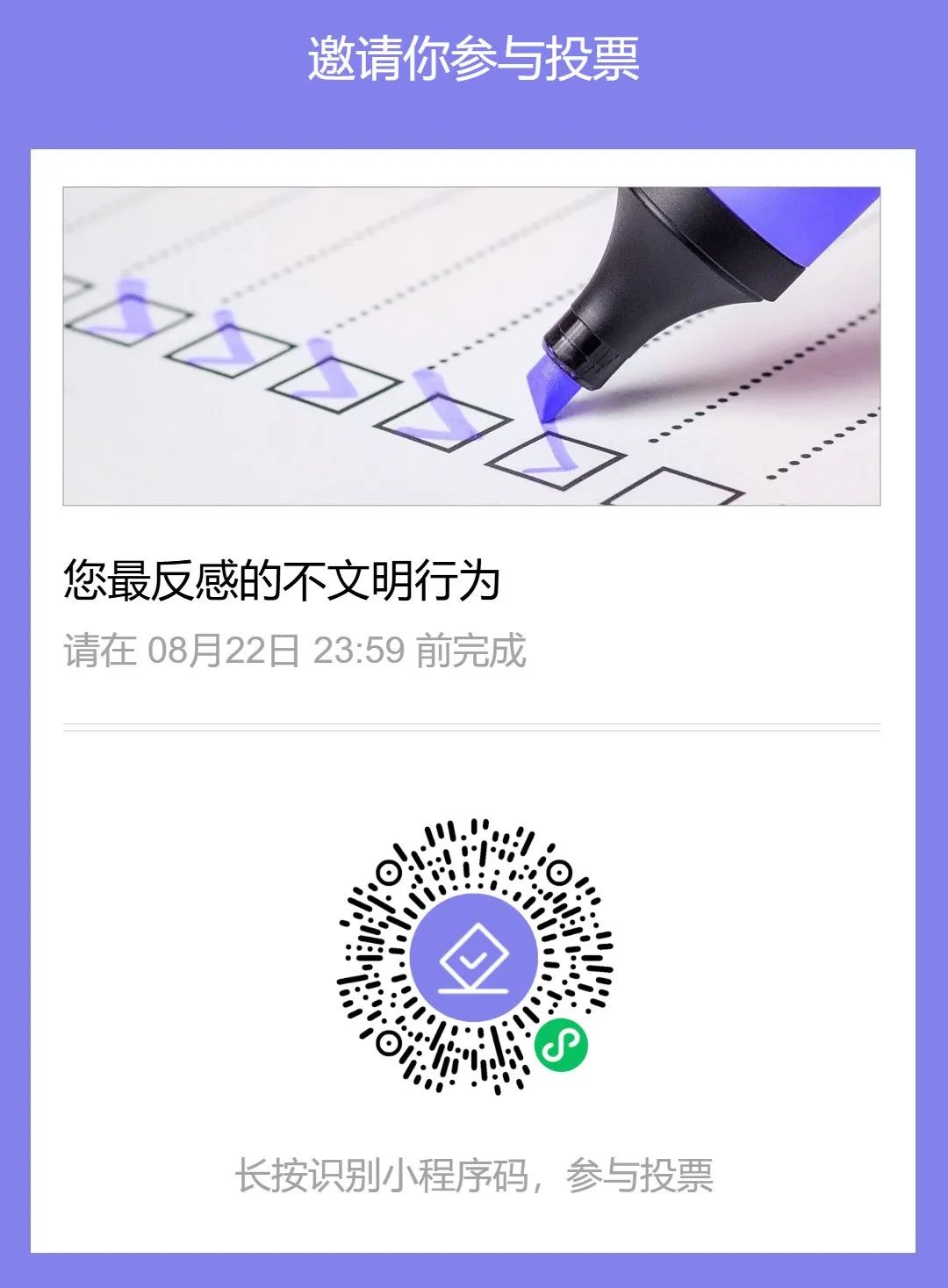 为倡树新时代美德健康生活方式,养成良好的文明习惯,营造美好生活环境,共建和谐美丽家园,8月8日至8月22日,市委宣传部(市文明办)牵头在全市组织开展“不文明行为”评议活动,请广大市民群众积极参与投票,