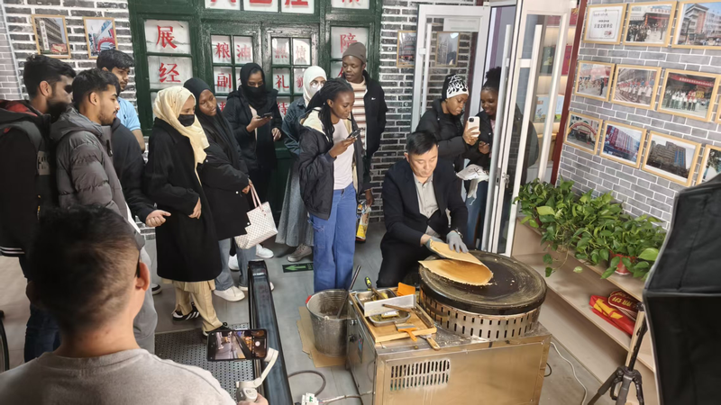 活动现场,传统美食制作展示区吸引了众多外国留学子的目光。大官庄村党总支书记黄平新正在展示山东煎饼的制作过程,金黄的煎饼在鏊子上翻转,香气四溢。外国朋友们纷纷拿出手机记录这一传统工艺,现场气氛热烈。